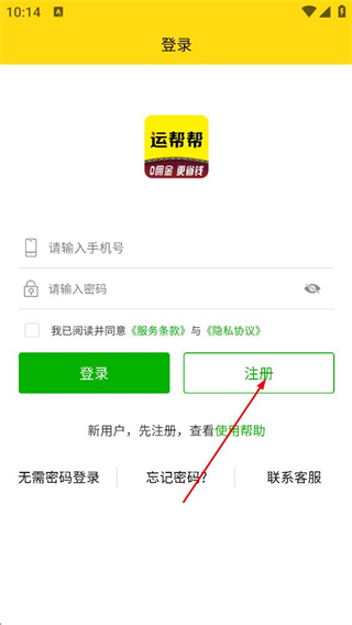 1、在运帮帮登录页面,点击注册按钮,进入账号注册操作界面。