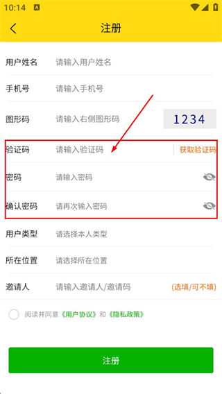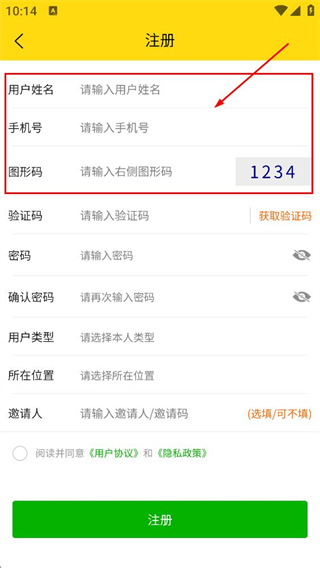 2、在注册界面,填写用户姓名手机号对应的信息,以及右侧图形码对应的内容。