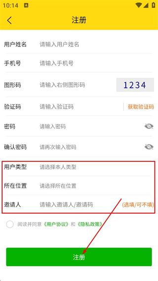 4、在注册界面,选择请选择本人类型、请选择所在位置,点击注册按钮完成账号注册。
