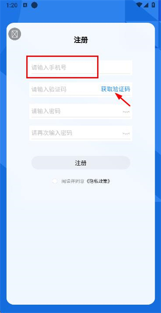 2、在注册账号页面填写手机号码后,点击获取验证码。