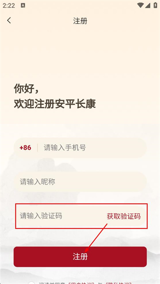 4、在注册界面,获取并填写验证码,点击注册,完成账号注册操作。