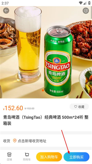 2、在饮品列表页面选择青岛啤酒经典啤酒商品,进入商品详情页面。