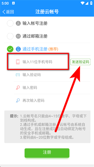 3、在注册云帐号页面,输入手机号码,点击发送验证码。