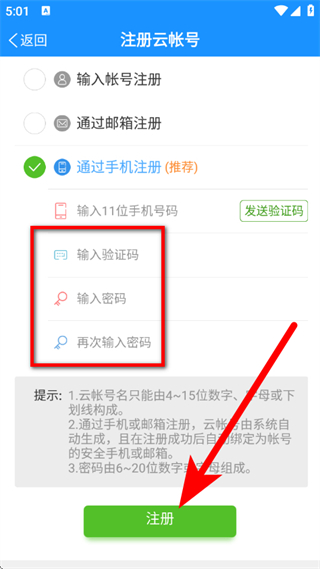 4、输入验证码,设置密码,点击注册,完成云帐号注册。