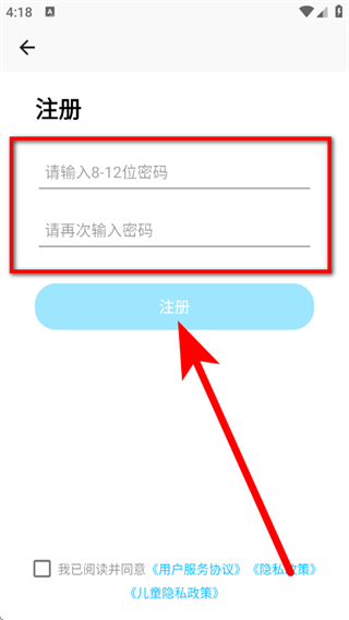 4、在设置密码页面,输入密码,勾选相关协议后,点击注册,完成注册。