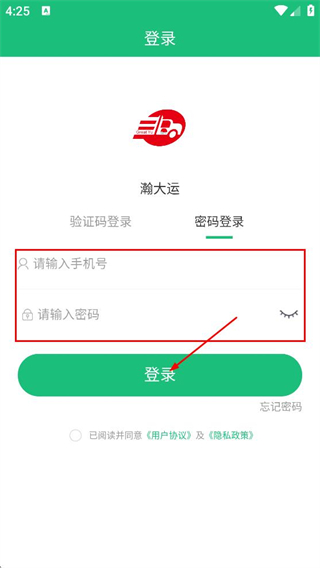 3、在密码登录界面,填写手机号和密码,点击登录完成潮大运账号的登录操作。