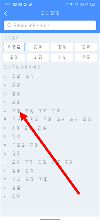 2、在添加城市页面,选择目标城市,完成城市切换。