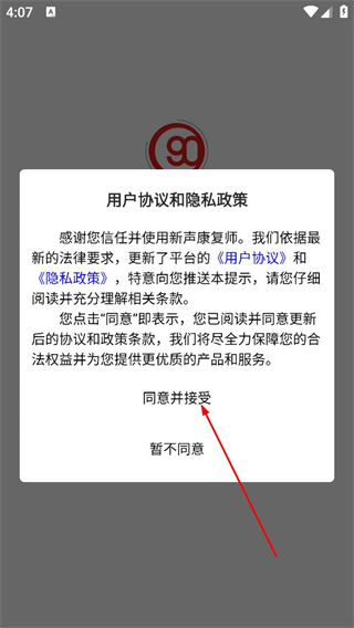 1、在用户协议和隐私政策弹窗中,点击同意,进入新声康复师的首页。
