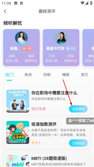 2、在趣味测评页面选择目标测评,点击立即测试按钮进入测评须知页。