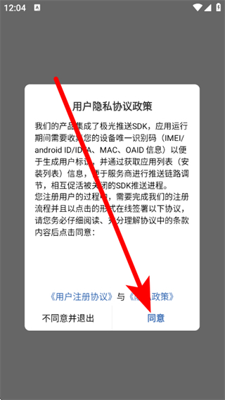 1、在用户隐私协议政策弹窗中,点击同意,进入登录页面。