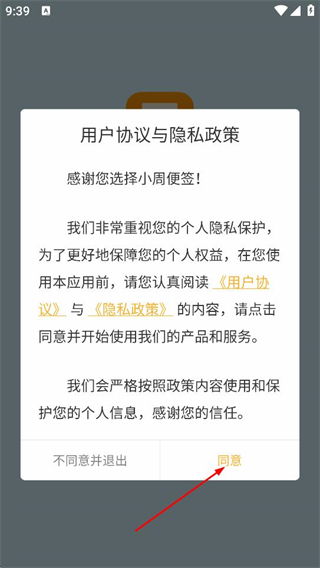1、在用户协议弹窗中,点击同意,进入小周便签的首页。