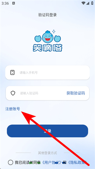 2、在验证码登录页面,点击注册账号,进入注册账号页面。