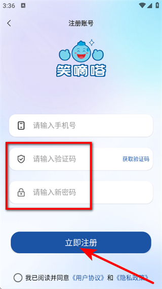4、输入验证码和设置新密码,勾选后,点击立即注册,完成账号注册。