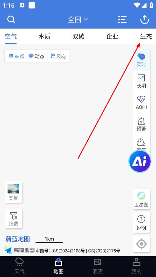 2、进入地图页面后,在上方的分类标签中,点击生态选项。