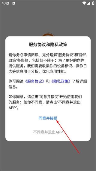 1、阅读服务协议和隐私政策,了解服务协议后,点击同意并接受。
