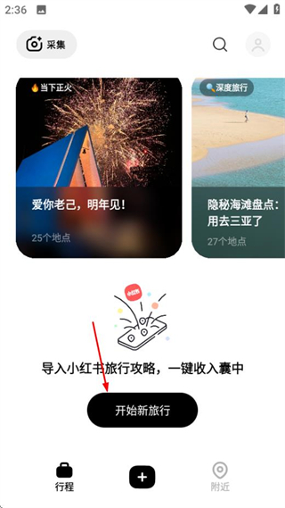 1、在圆周旅迹首页点击开始新旅行按钮,进入目的地输入页面。