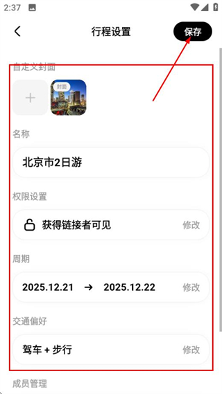 5、在行程设置页调整信息后,点击保存按钮完成行程设置。