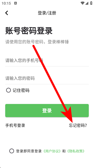 4、在账号密码登录页面,点击忘记密码,进入设置修改密码页面。