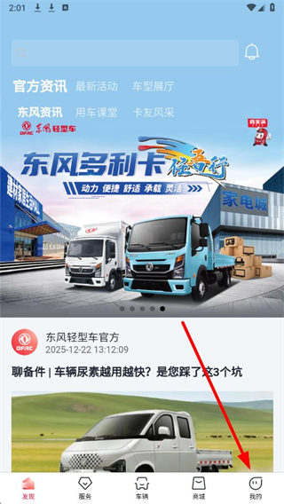 1、打开东风e车APP后,在首页底部找到我的选项并点击,进入个人界面。