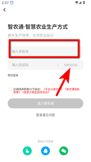4、输入收到的短信验证码,勾选协议后,点击进入智农通按钮,即可完成登录操作。