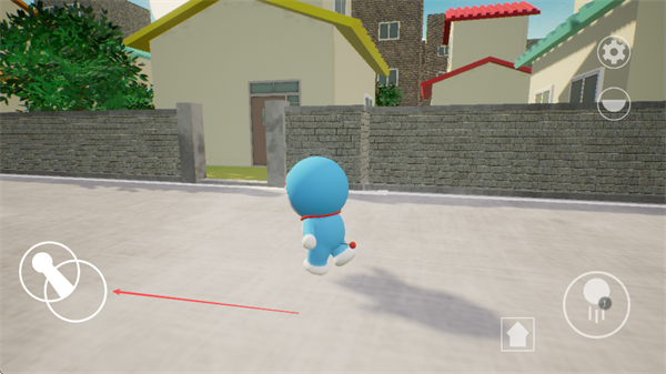 1、操控哆啦A梦在户外区域移动,通过左侧操控键调整方向,向目标建筑行进。