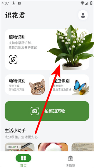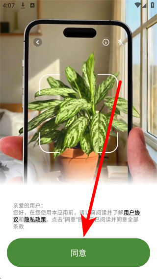 1、打开识花君,在用户协议弹窗中点击同意,进入应用主界面。
