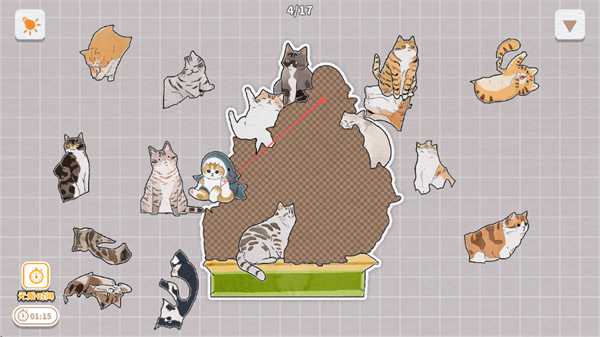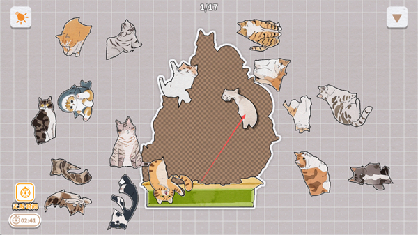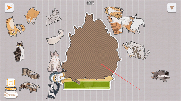 1、观察棕色区域轮廓,挑选匹配的猫咪碎片,尝试放入区域,完成0/17到1/17的进度。