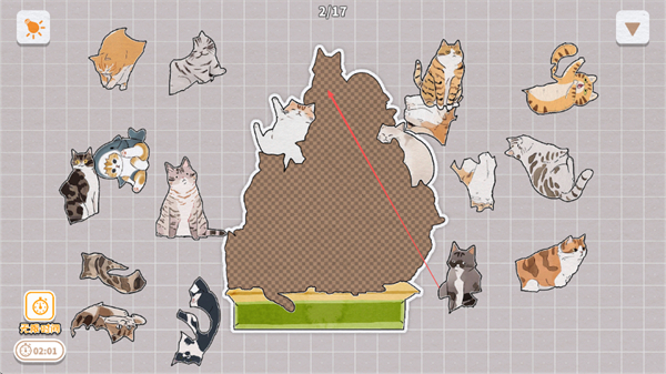 2、继续选取契合的猫咪碎片,放入棕色区域的对应位置,推进进度至2/17。