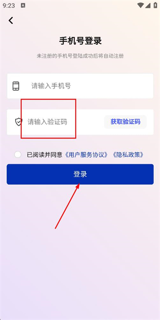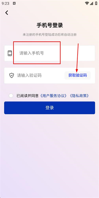 2、在登录页面填写手机号,勾选协议后,点击获取验证码。