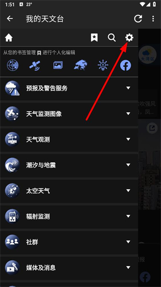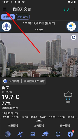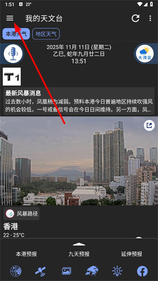 1、打开我的天文台APP后,点击界面左上角的菜单按钮,展开功能选项列表。