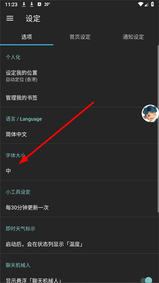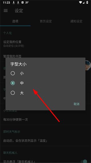 3、在设定页面的个人化板块中,找到字体大小选项并点击,弹出字体大小选择弹窗。