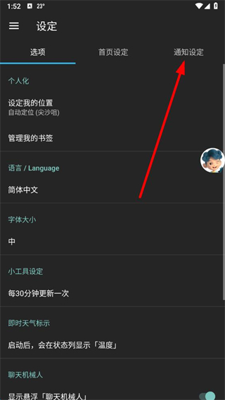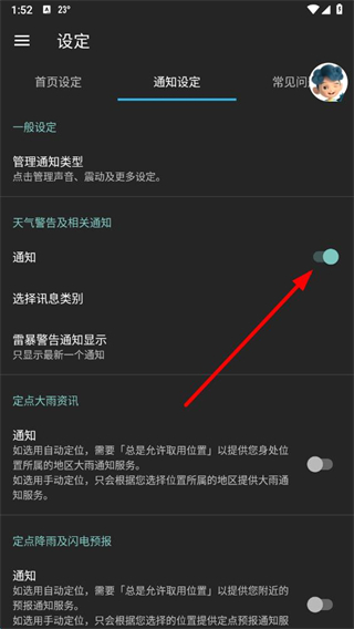 4、在通知设定页面,找到天气警告及相关通知下的通知开关按钮,将其关闭即可关闭通知。