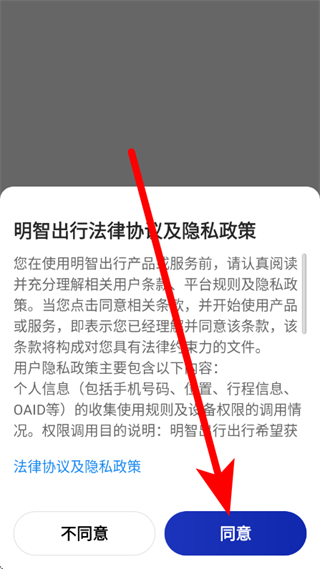 1、打开明智出行,在弹窗点击同意,进入欢迎登录注册页面。