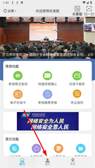 1、打开云南人社APP后,点击首页底部我的选项,进入我的个人界面。