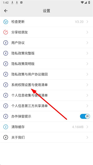 3、在设置页面中,找到系统权限设置与使用清单选项并点击,进入权限相关的设置界面。