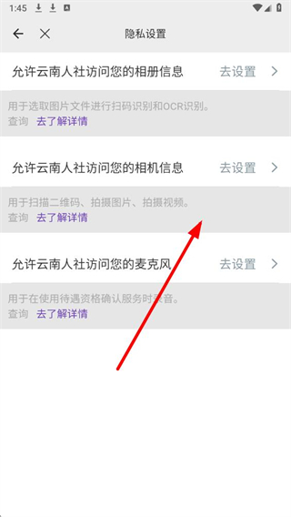 4、在系统权限设置界面中,点击对应选项的去设置,即可管理隐私相关的权限设置。