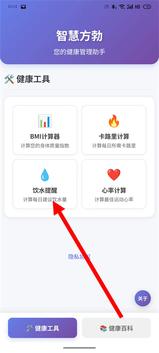 1、打开智慧方勃,点击饮水提醒选项,进入饮水提醒计算页面。