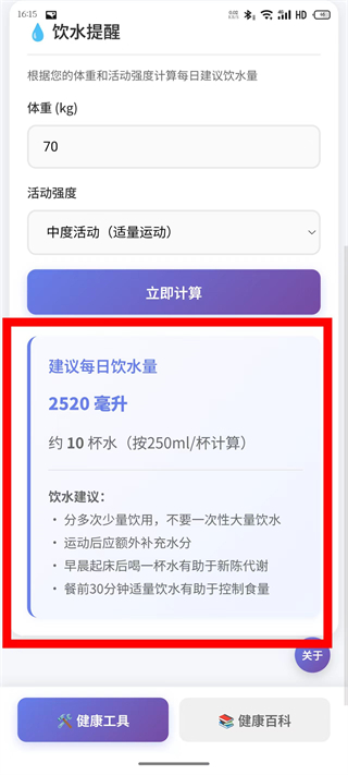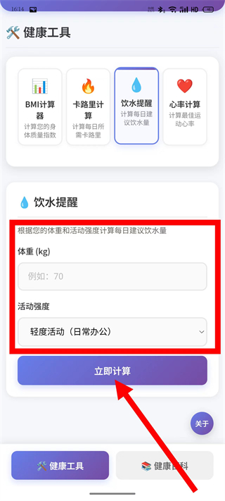 2、在饮水提醒计算页面,输入体重并选择活动强度,点击立即计算。