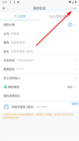 2、在我的信息页面,点击右上角的三点图标,切换至企业/组织/团队标签页。