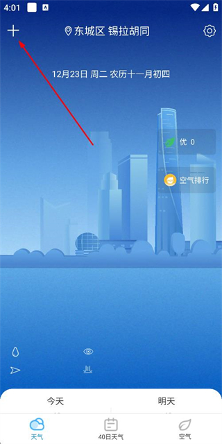 1、在天气主页面点击左上角的加号按钮,进入城市管理页面。