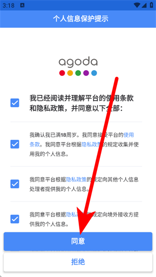 1、打开Agoda,确认已勾选相关条款后,点击同意,进入登录或创建账户页面。