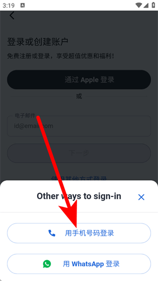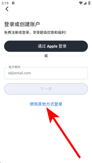 2、在登录创建账户页面,点击使用其他方式登录,弹出登录方式选择框。