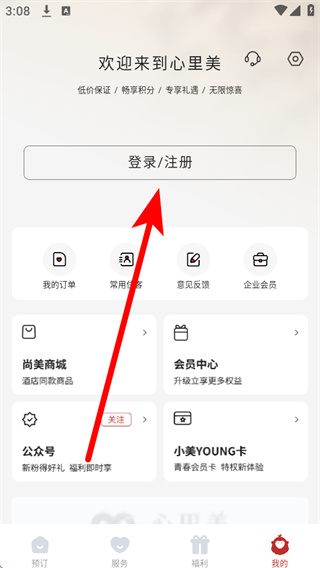 1、打开心里美酒店预订,点击底部导航栏的我的,进入个人中心页面。