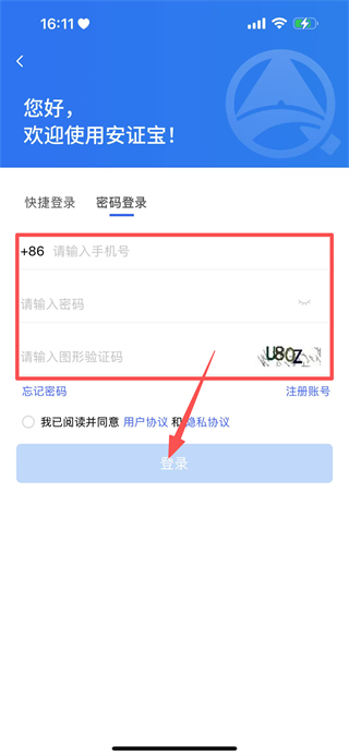 4、在登录页,填写手机号、密码、图形验证码,完成后点击登录,完成账号登录。