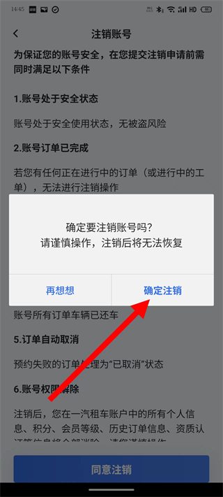 4、在注销账号页面,确认满足所有注销条件后,点击同意注销。