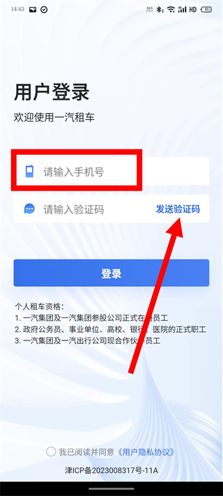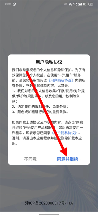1、打开一汽租车,点击同意并继续,进入登录页面。