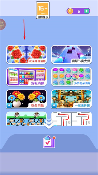 2、进入游戏主界面,找到花朵连线消除对应的图标,点击该图标进入游戏关卡选择界面。
