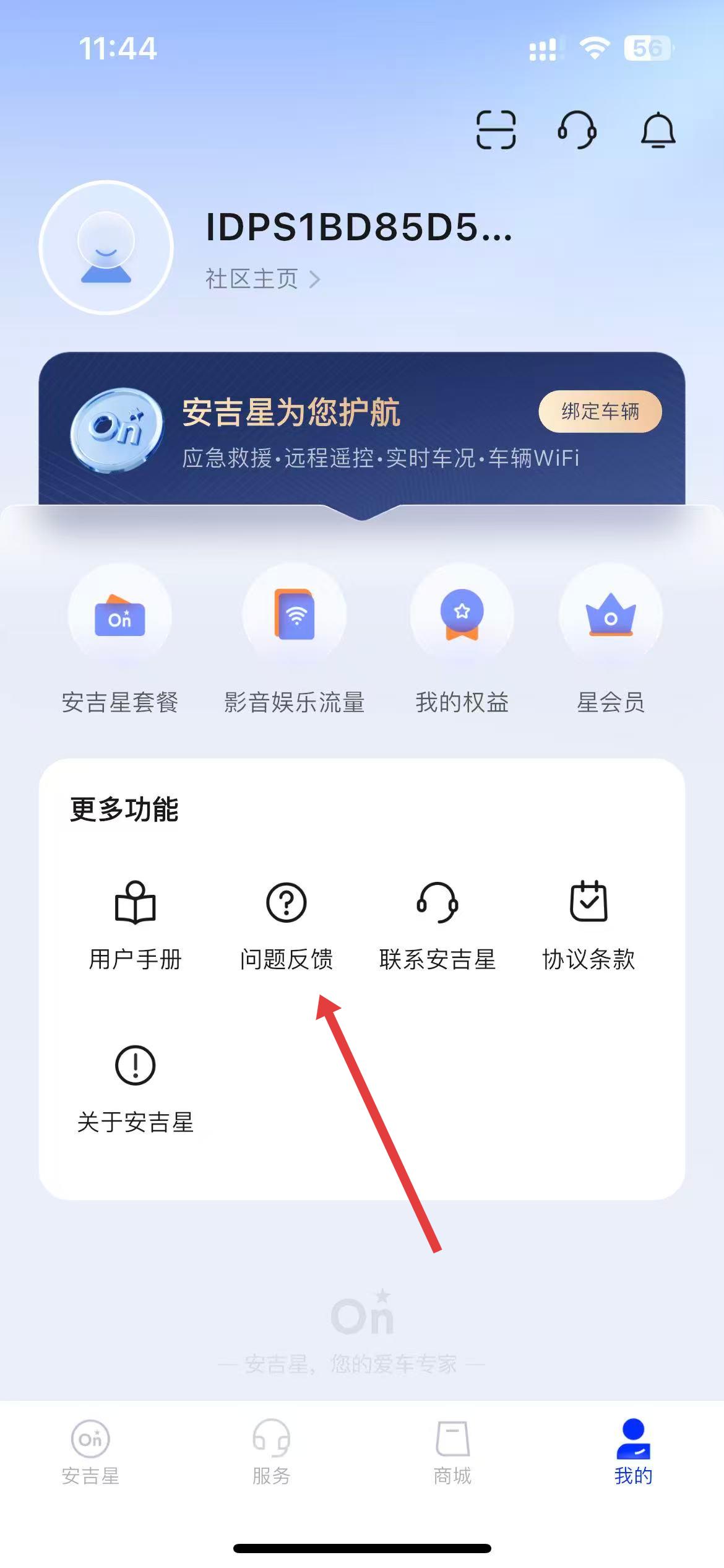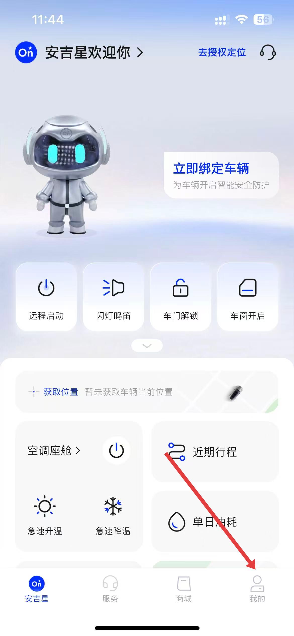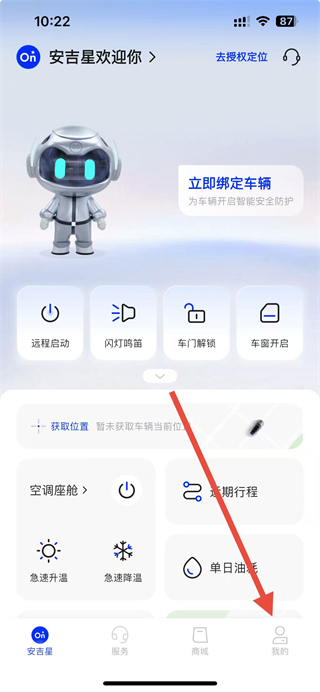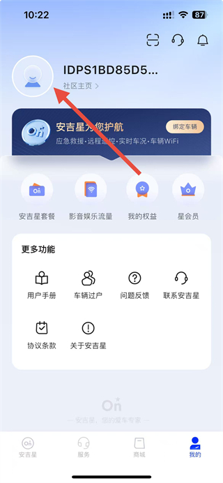1、进入安吉星app,点击首页底部我的选项,进入我的个人页面。