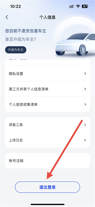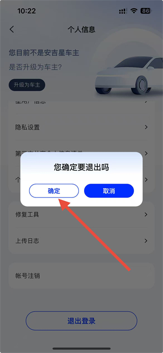 4、在提示弹窗中,点击确定选项,即可完成安吉星账号的退出登录操作。
