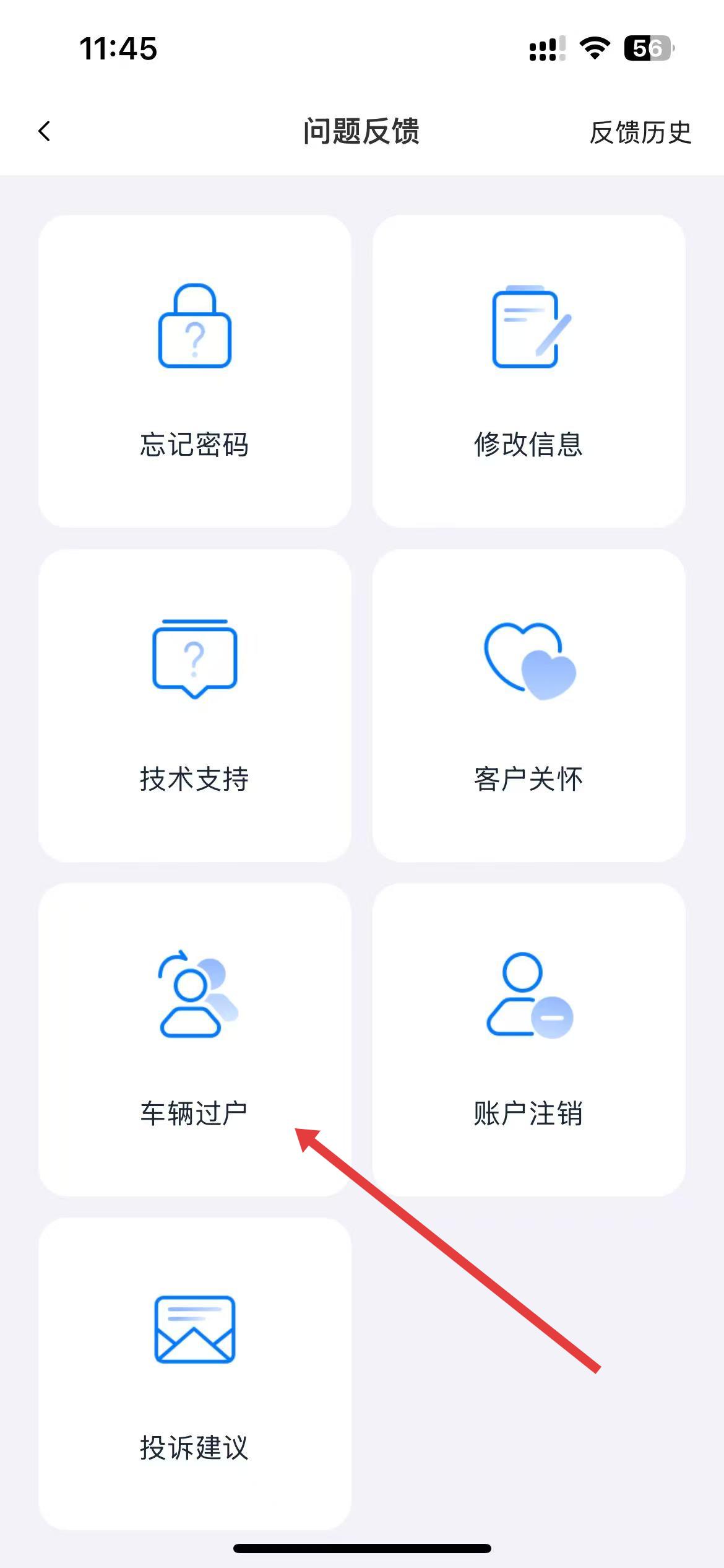 3、在问题反馈界面中,选择车辆过户选项,进入车辆过户申请页面。